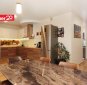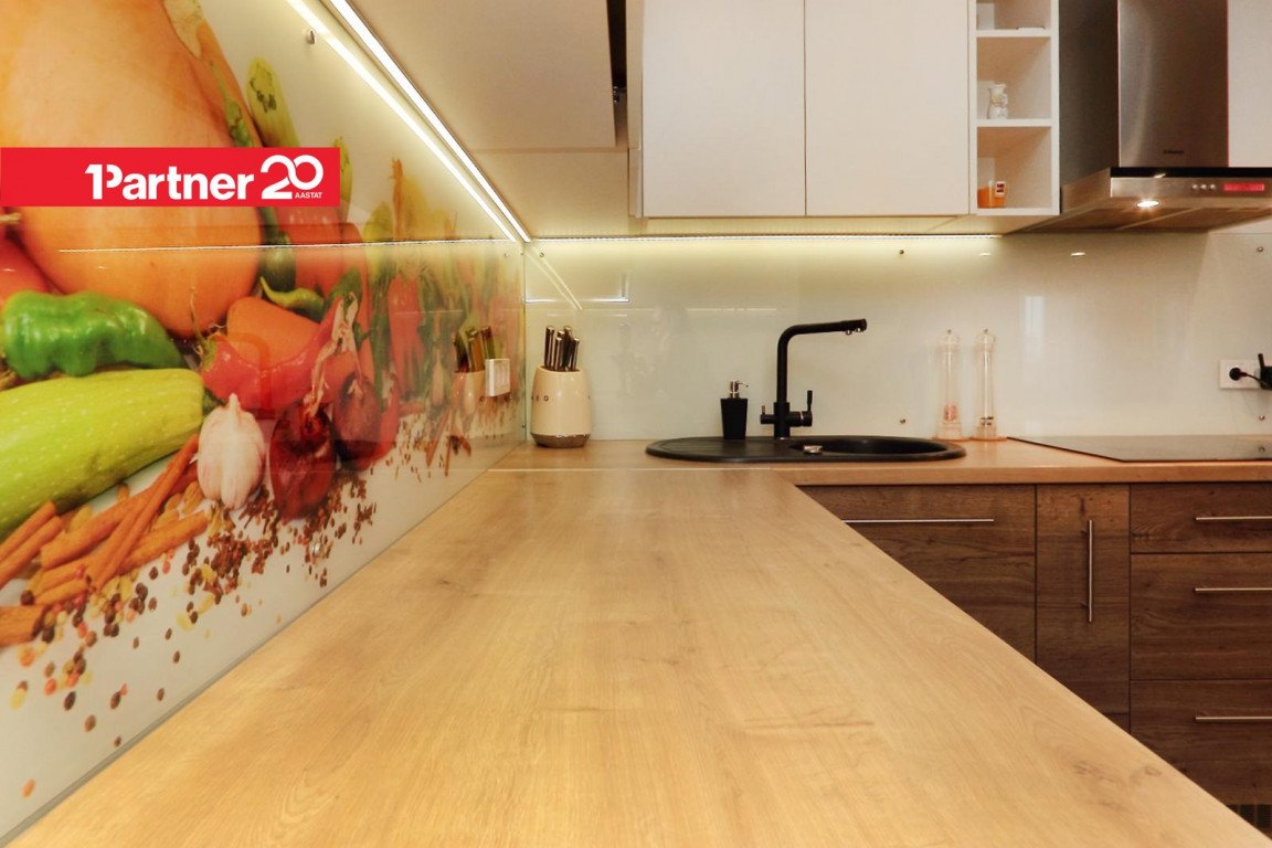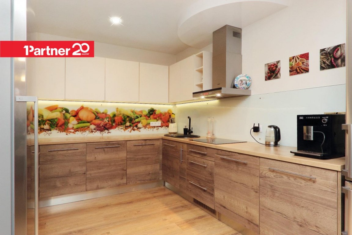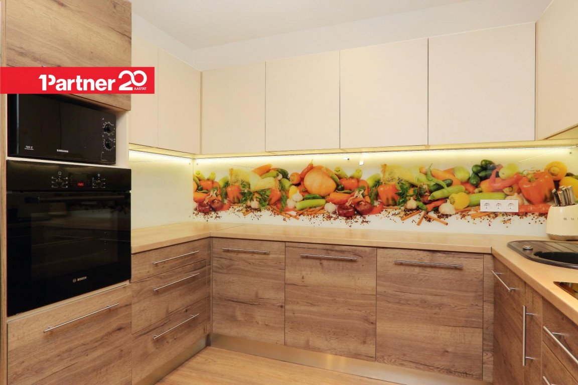 Köögis on köögimööbel koos tehnikaga (keraamiline pliit, küpsetusahi, kubu, külmkapp ja sügavkülmik, nõudepesumasin, mikrolaineahi).