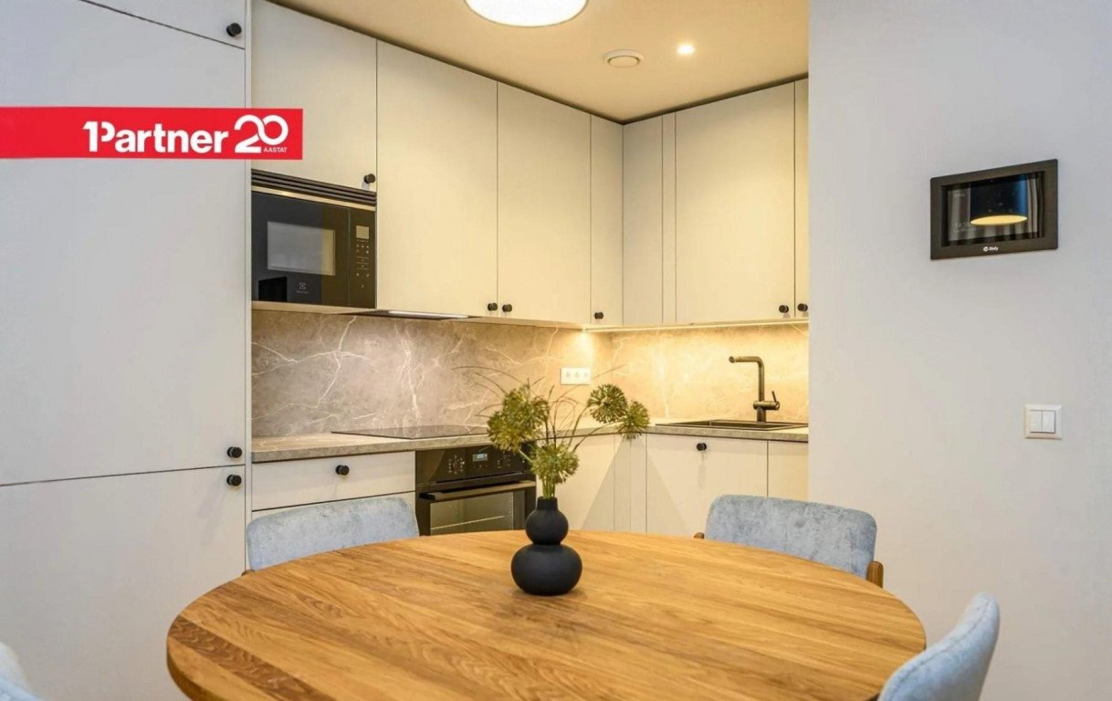 Kööki on paigaldatud kaasaegne köögimööbel koos vajaliku tehnikaga: induktsioonpliit, ahi, integreeritud külmkapp ja mitmefunktsiooniline mikrolaineahi. Piisavalt töötasapinda.