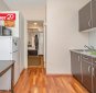Köögis on lihtne köögimööbel, keraamiline pliit ja külmkapp.