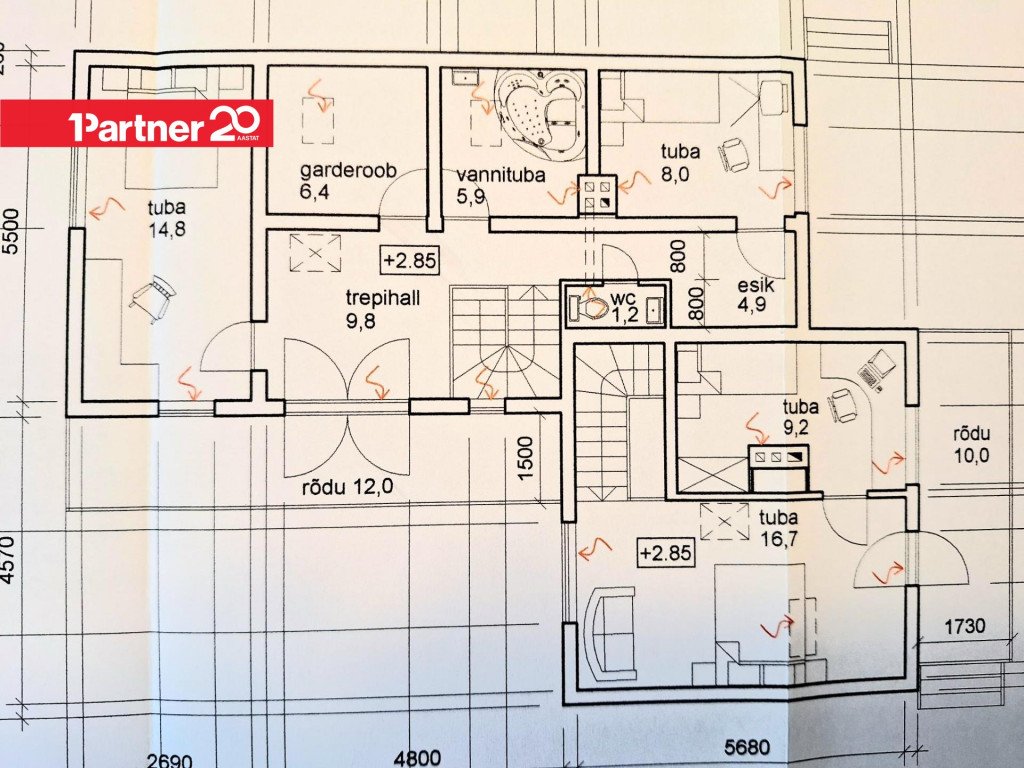 2. korrus: 2 treppi viivad eraldi tsoonidesse – üks elutoast, teine koridorist. Ühes osas avar magamistuba (katuseaken, rõdu), lisatuba. Teises osas trepihall, 2 magamistuba, garderoob (võimalik magamistuba), mullivanniga vannituba, eraldi WC.
