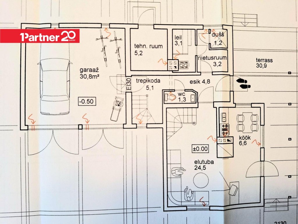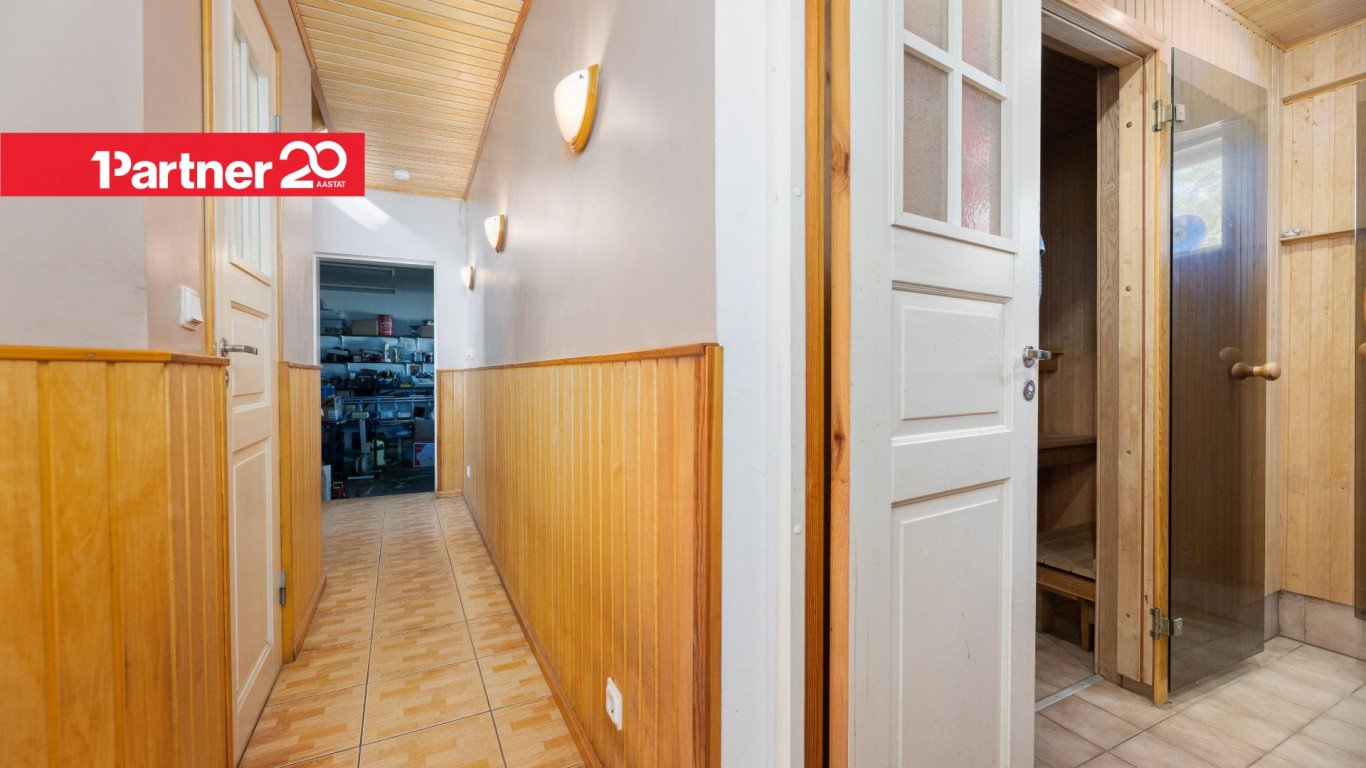 1. korrus: esik, elutuba (kamin ja soojamüür), poolavatud köök (pääs terrassile), puuküttega saun, eesruum, duširuum, eraldi WC, tehnoruum, garaaž, varjualune (hiljem juurde ehitatud ja pole registrisse kantud, võimalik ka lammutada).