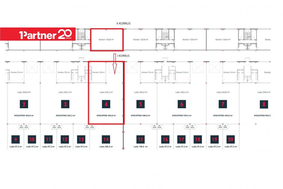 Üldpind 454,8m² sh I korrus 327m² ja II korrus kontor 126,8m².