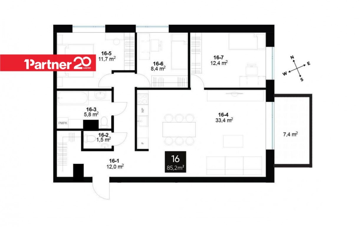 * Korteri üldpind on 85,2 m², millele lisandub 7,4 m² suurune rõdu, pakkudes avarat ja peresõbralikku eluruumi.