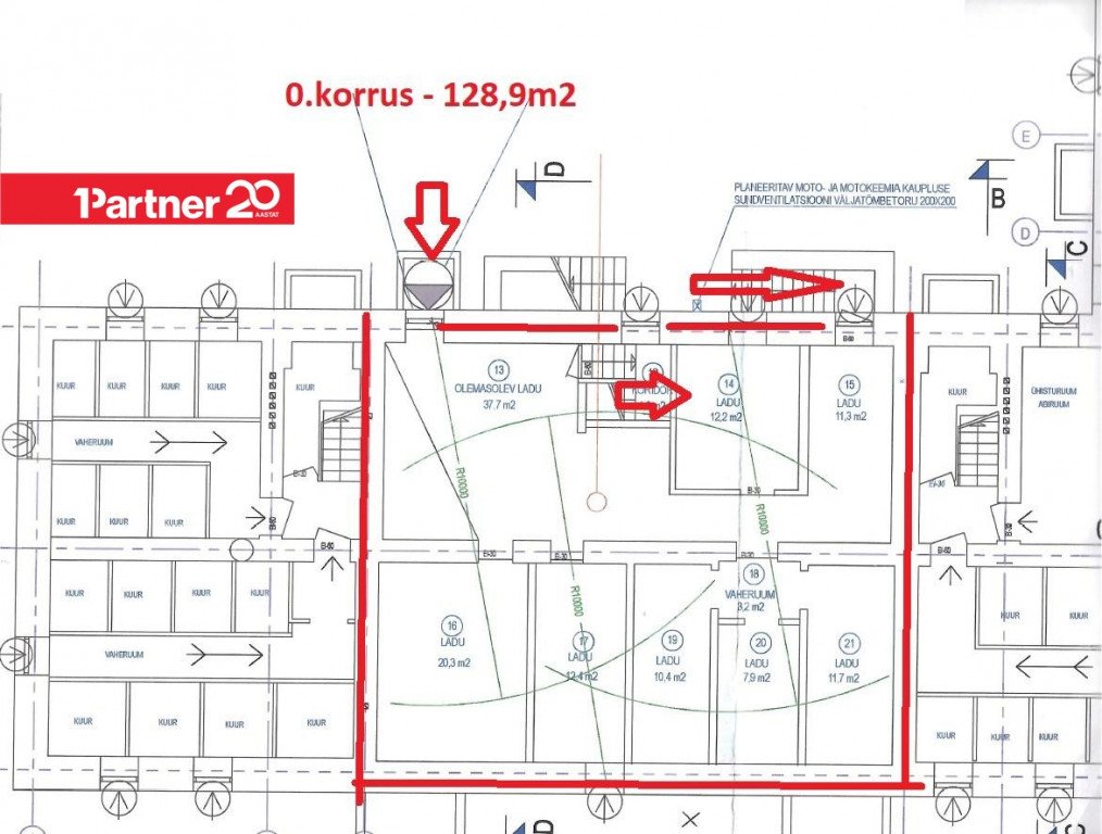 0. korrus: erineva suurusega laoruumid; otse sissepääs hoovist trepi ja tõstukiga ning 1.korruse äripinnast.