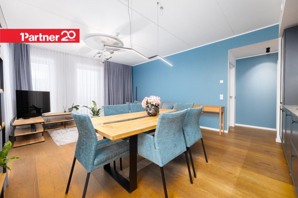 Köök ja elutuba on avatud planeeringuga, kaks magamistuba paiknevad korteri eri tiibades, pakkudes elanikele privaatsust. Lõunapoolse asetusega rõdult avanevad vaated Ülemiste järvele, metsarohelusele ja Nõmme suunas – tegemist on hoone parima ilmakaarte suunaga, kus on võimalik nautida maksimaalset päikesevalgust, näha nii päikesetõusu kui ka -loojangut ning veeta mõnusalt aega.