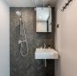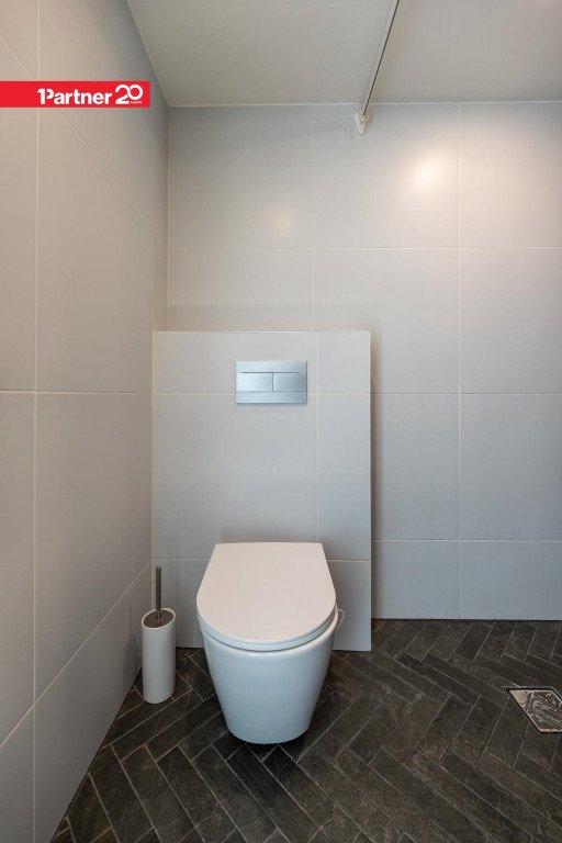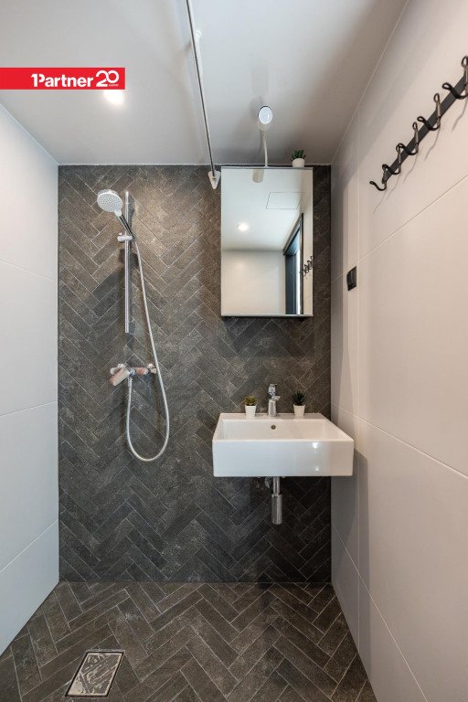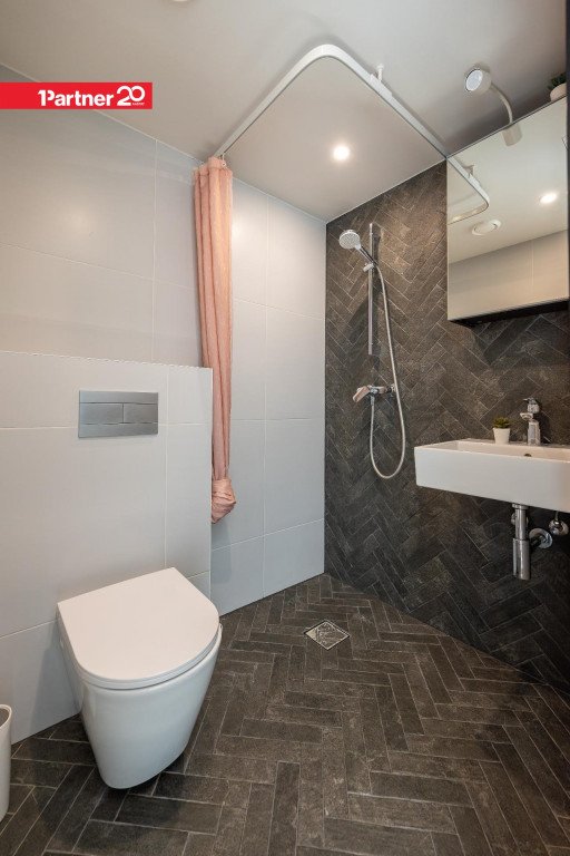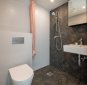 Vannituba on kaasaegselt ja maitsekalt viimistletud, kus tumedates toonides kalasabamustriga plaadid loovad modernse ja elegantse ilme.