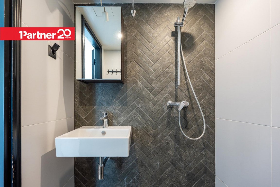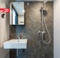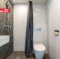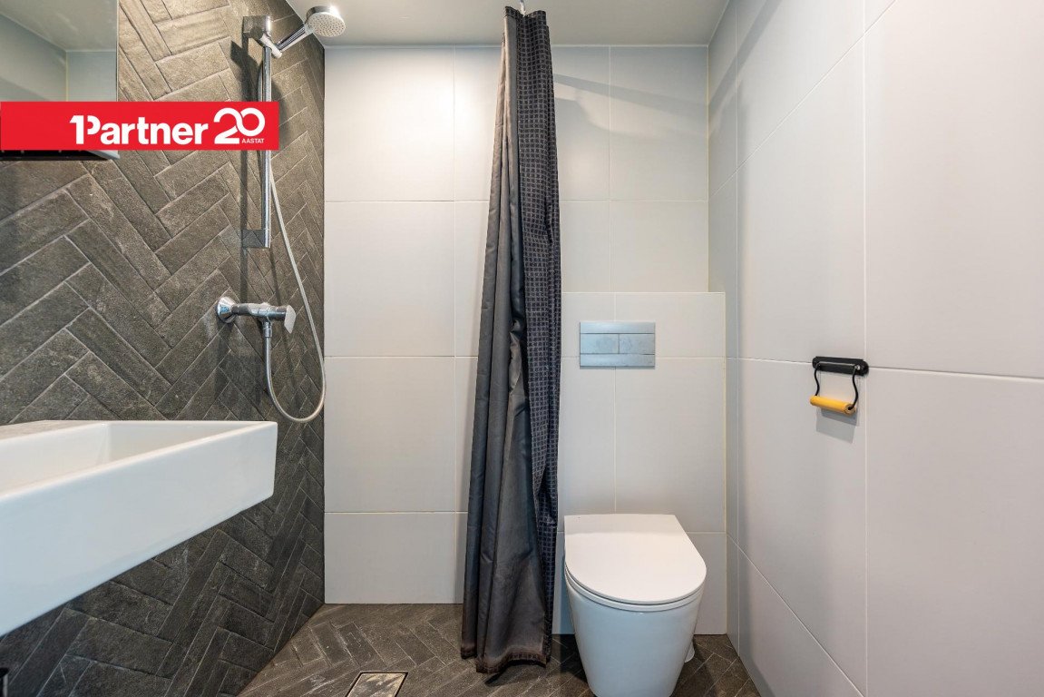 Vannituba on kaasaegselt ja maitsekalt viimistletud, kus tumedates toonides kalasabamustriga plaadid loovad modernse ja elegantse ilme.