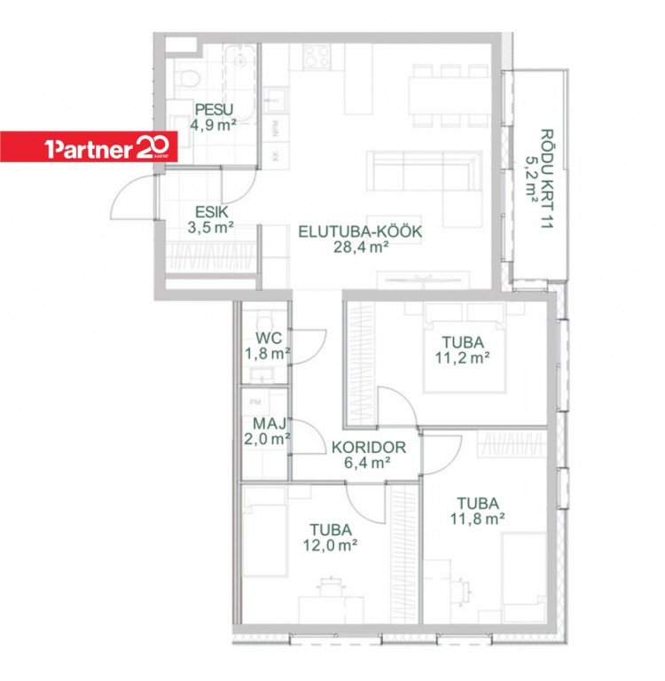 Korter nr 11 on avar 4-toaline suurusega 82,9m². Korteris on avatud köögiga elutuba ja kolm magamistuba ning 2 wc-d. Korterile lisab avarust 5,2m²suurune rõdu.