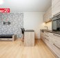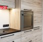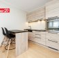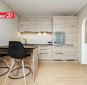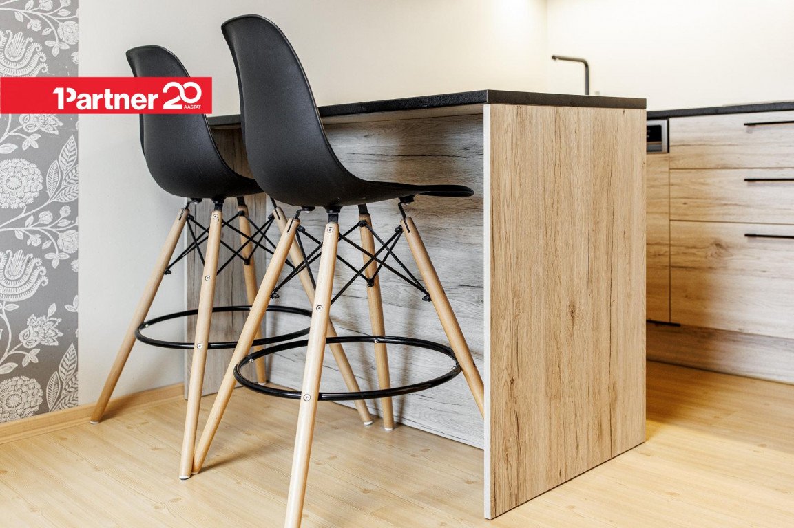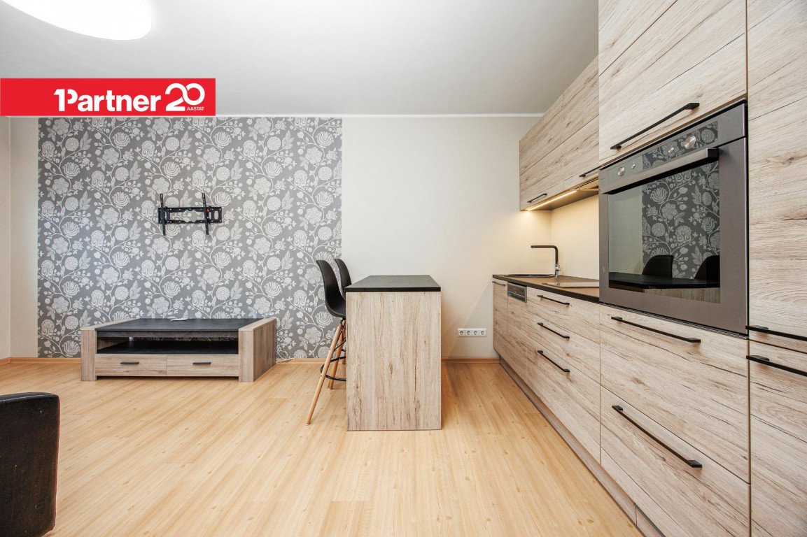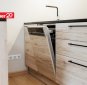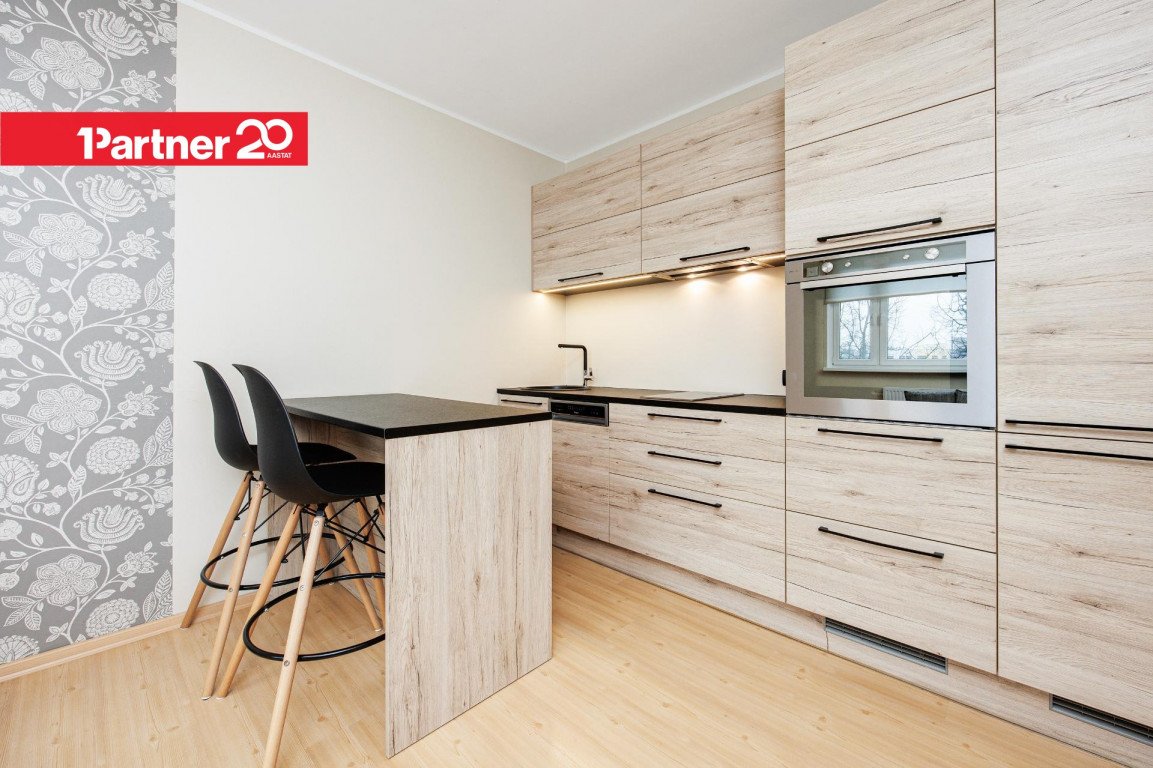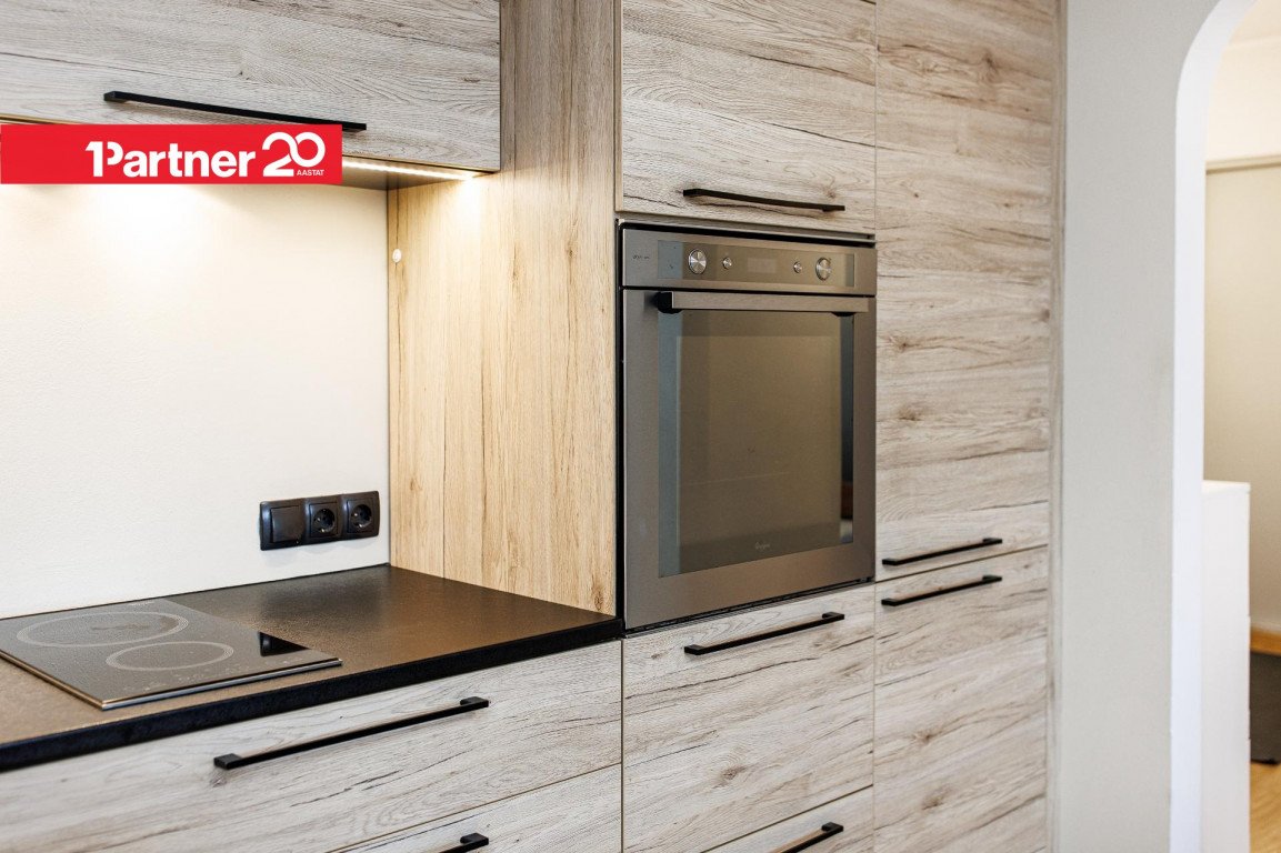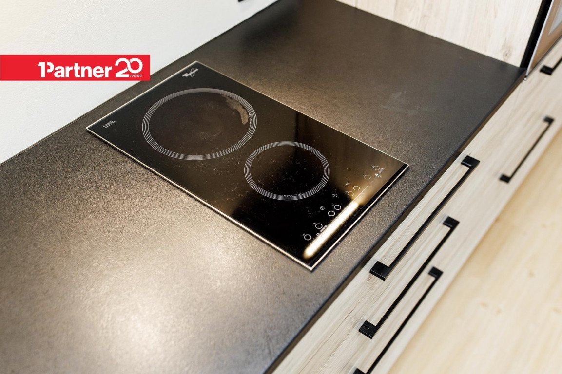 Kaasaegne köögimööbel. Köögitehnika hulka kuuluvad integreeritud külmkapp, nõudepesumasin, kahe plaadiga induktsioonpliit, küpsetusahi ja õhupuhasti.