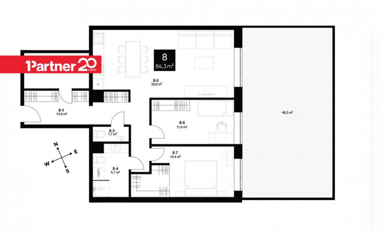 * Korteri üldpind on 84,3 m², millele lisandub 48,5 m² suurune terrass, pakkudes avarat ja peresõbralikku eluruumi.