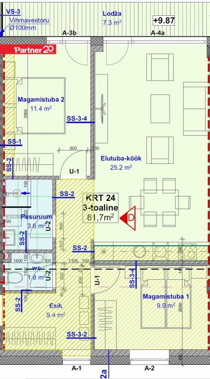 * Mugav planeering: avatud elutuba-köök (25,2 m²), kaks magamistuba (11,4 m² ja 9,9 m²), eraldi WC (1,8 m²) ja vannituba (3,6 m²), avar esik (9,4 m²)