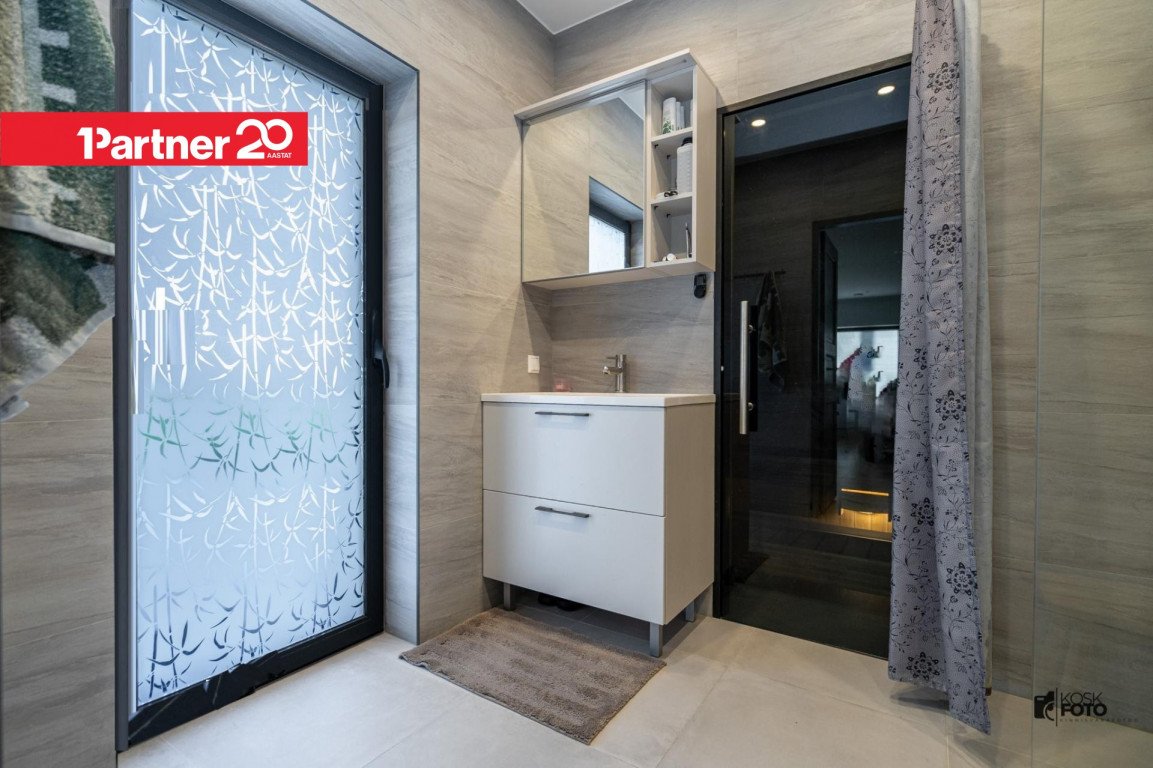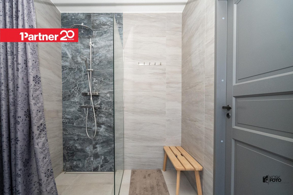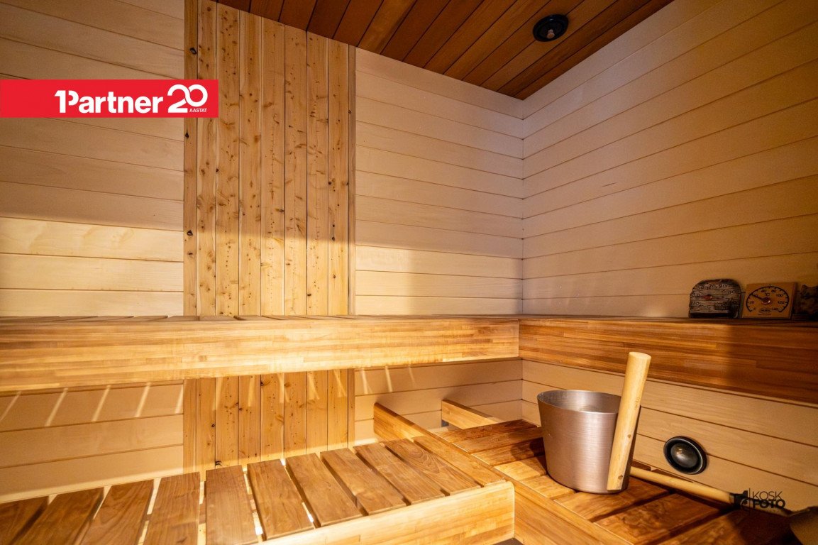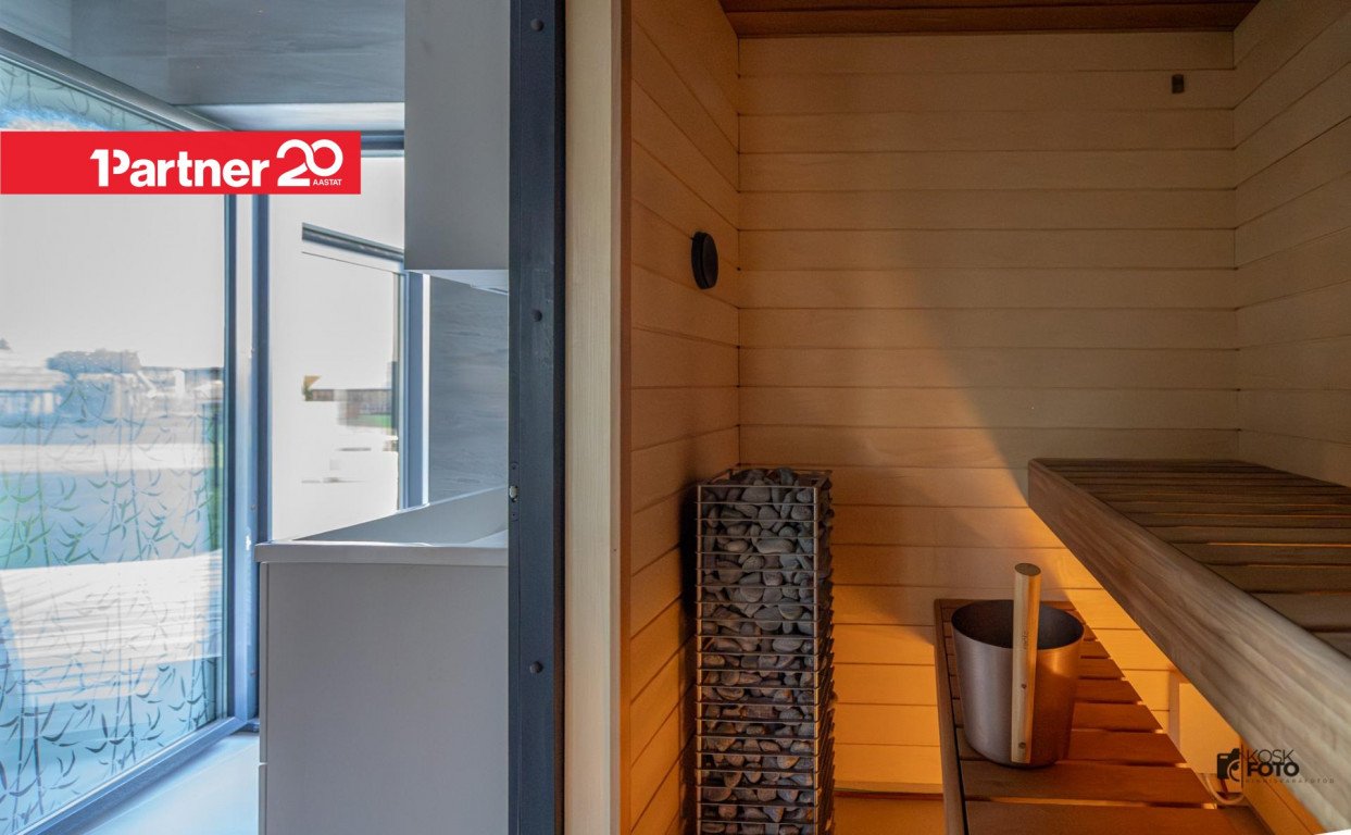 HUUM -elektrikerisega saun, mida saab nutikalt eemalt juhtida. Sauna eesruum dušinurgaga ja pääs terrassile.