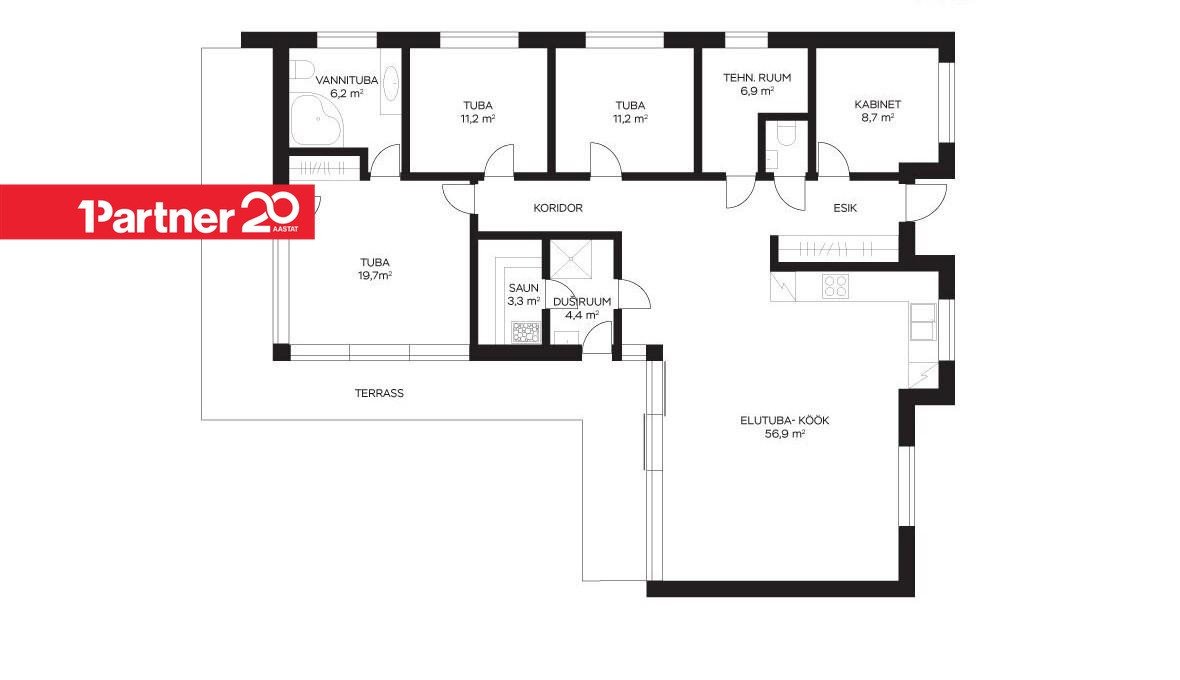 avatud köögiga suur elutuba 56m², kuhu paistab ennelõuna-ja päevapäike, terrass on aga avatud pealelõuna päikesele.