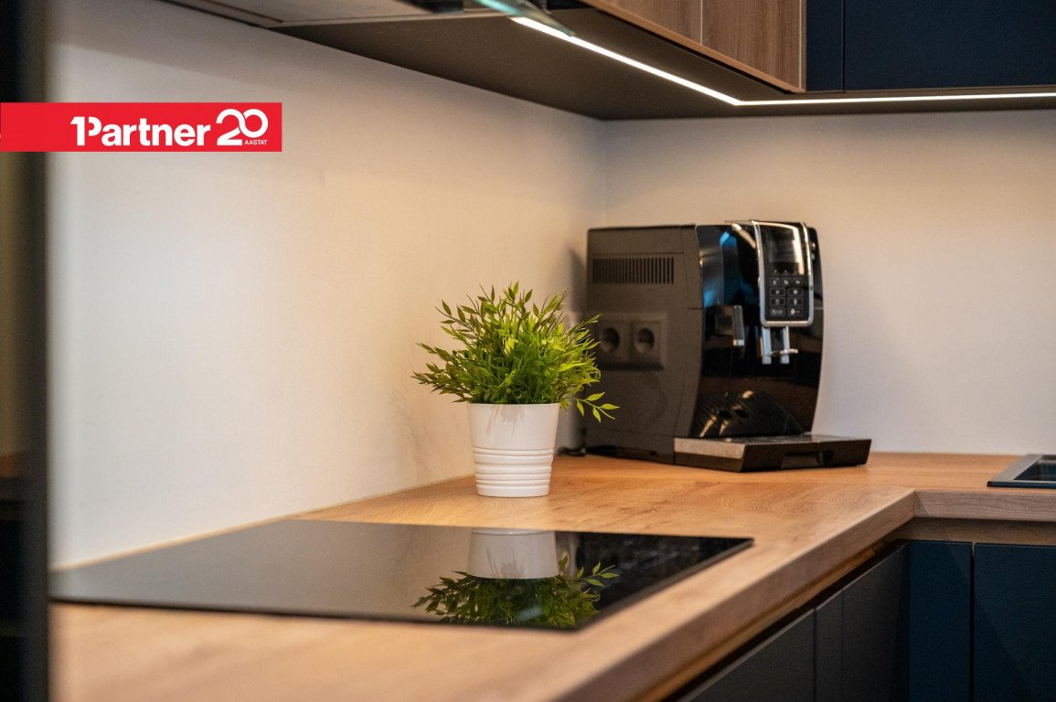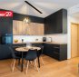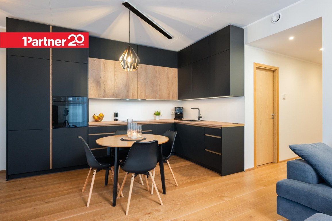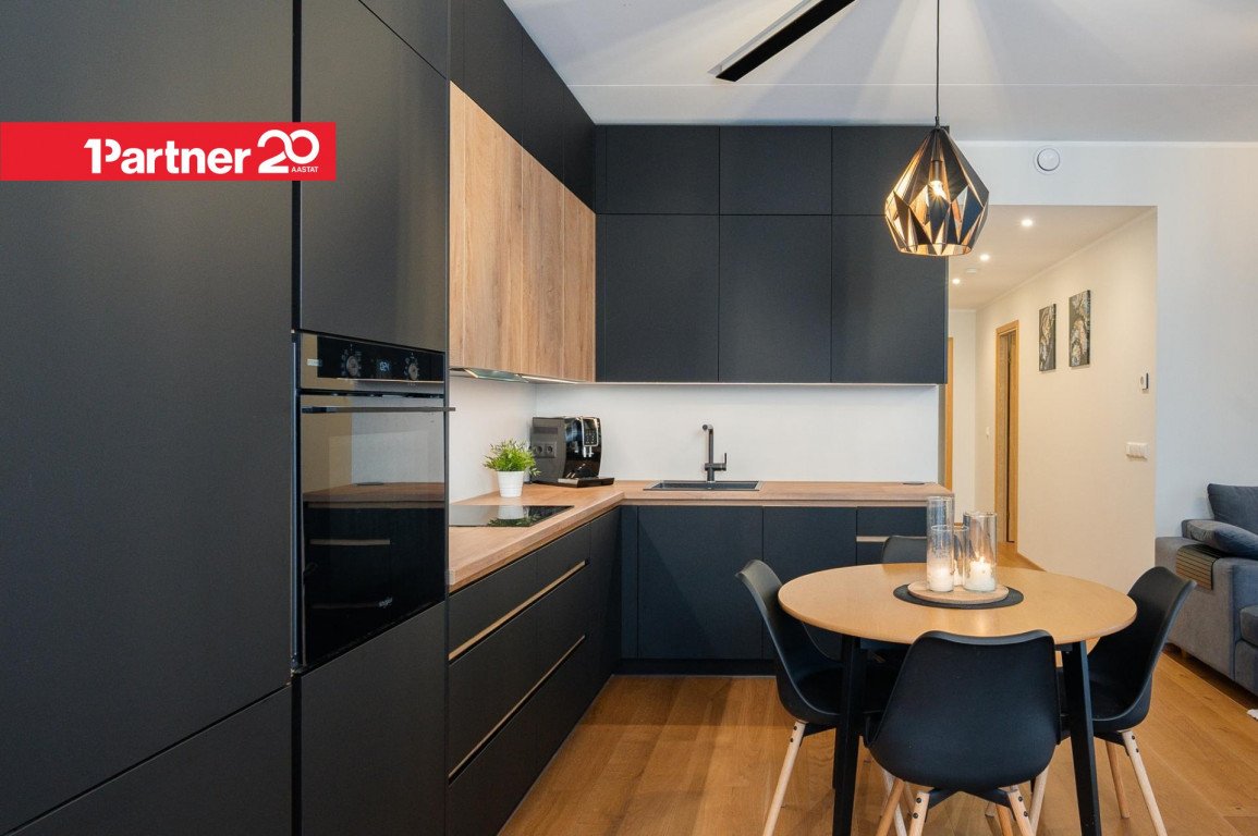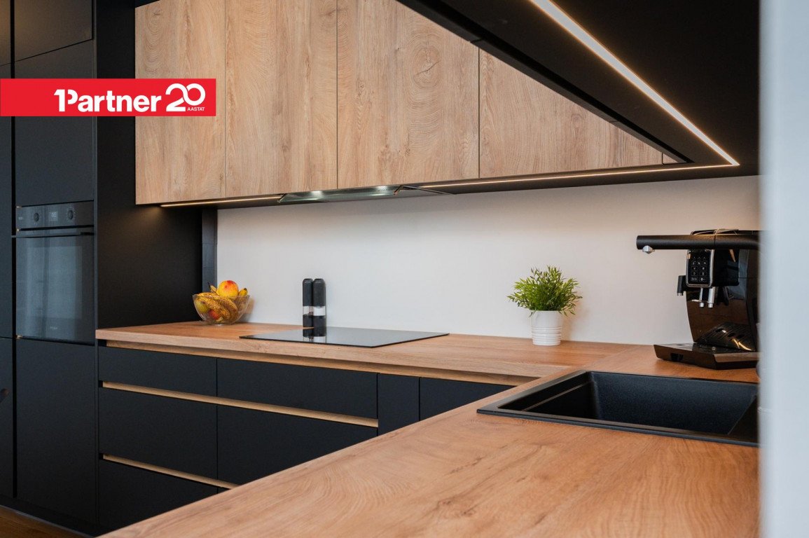 Avatud köök ja elutuba – kvaliteetne Arensi köögimööbel modernses musta ja puidutooni kombinatsioonis. Mustad pinnad on valmistatud nano-/fenix-materjalist, mis ei võta kergesti sõrmejälgi. Köögis on integreeritud kodutehnika ning hubane söögiala.