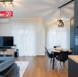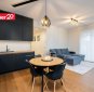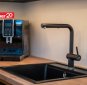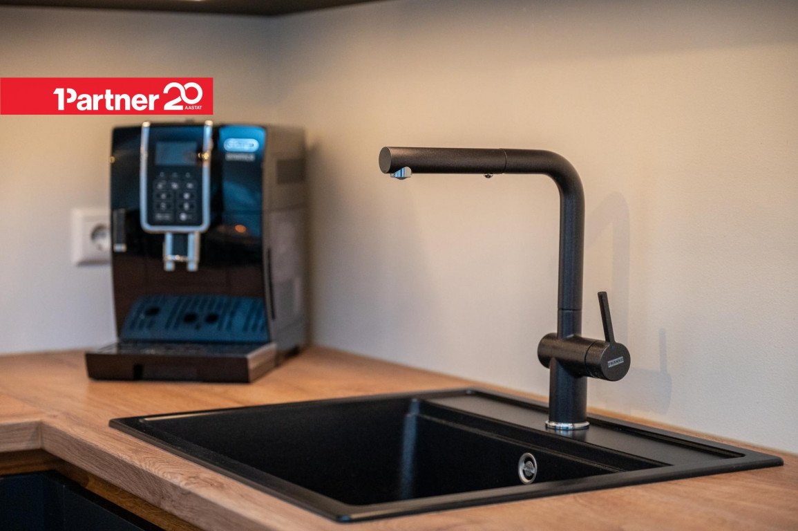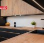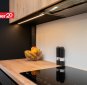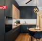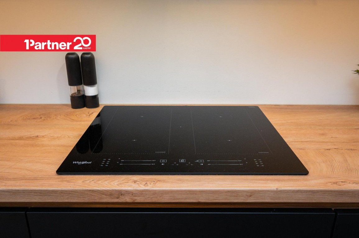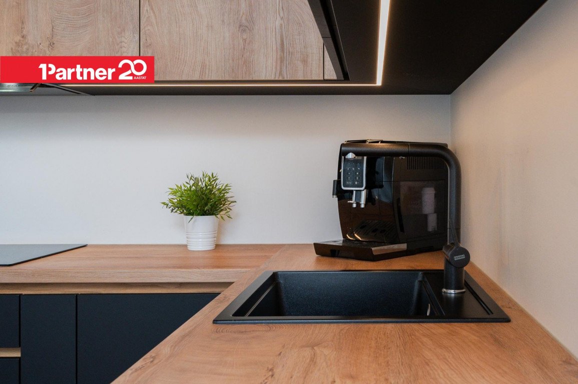 Avatud köök ja elutuba – kvaliteetne Arensi köögimööbel modernses musta ja puidutooni kombinatsioonis. Mustad pinnad on valmistatud nano-/fenix-materjalist, mis ei võta kergesti sõrmejälgi. Köögis on integreeritud kodutehnika ning hubane söögiala.