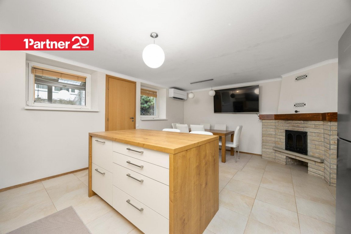 Kõige alumisel, maapealsel soklikorrusel avaneb avar ning erilise atmosfääriga köök, kus on samuti kamin ning millest pääseb otse aeda. Köök on väga heas seisukorras, funktsionaalne ja kvaliteetne, sisustatud Schmidt firma köögimööbliga ning mugava planeeringuga.