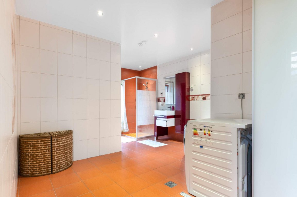 Lisaks köögile ja elutoale jäävad 1. korrusele veel suur saunaga (3,4 m²) vannituba (13,3 m²) , eraldi sissepääsuga garaaž, millest omakorda pääseb tehnilisse ruumi (6,5 m²).