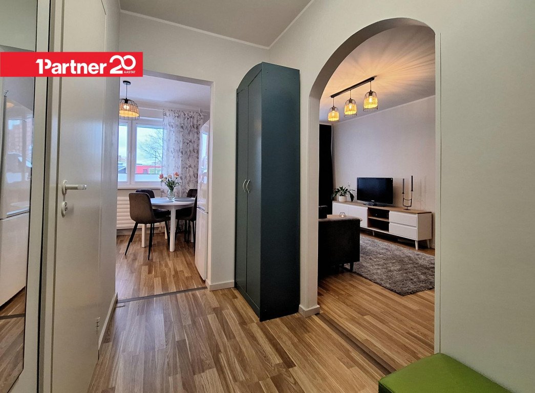 Üldmulje korterisse sisenedes on helge ja avar. Korteri praktiline planeering ühendab mugavalt esiku, panipaiga, vannitoa, köögi ja elutoa. Elutoast pääseb klaasitud rõdule. Korter on täielikult möbleeritud, esikus on lisaks panipaigale ka riidekapp ja üleriiete nagi. Ruumikas köögis on funktsionaalne köögimööbel koos induktsioonpliidi, nõudepesumasina, elektriahju ja külmkapiga, söögilaud toolidega. Elutoas on diivan, diivanilaud, TV-kapp, televiisor, põrandariiulid, kummut ja 140cm lai voodi. Vannitoas on vann ning panipaigas pesumasin.